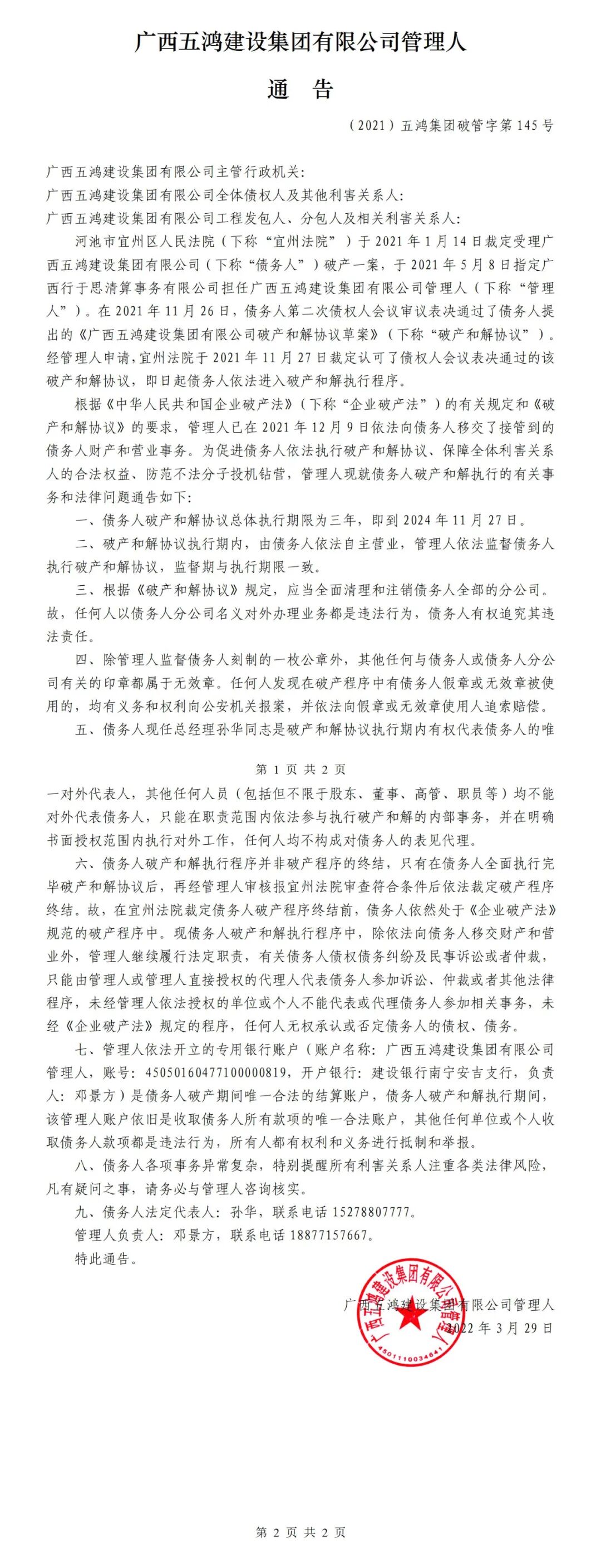 >> 广西五鸿建设集团有限公司破产和解执行通告